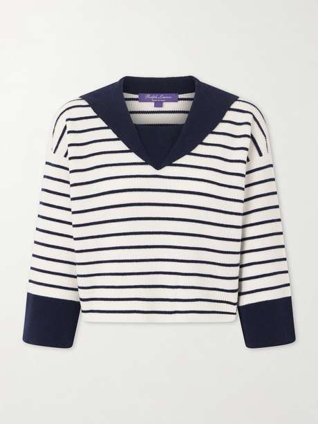 Ralph Lauren Collection's sweater has a nautical slant to it. Knitted from soft cashmere, it has a sailor-inspired contrasting neckline and is decked in stripes. Nod to the inspiration and wear yours with wide-leg pants.