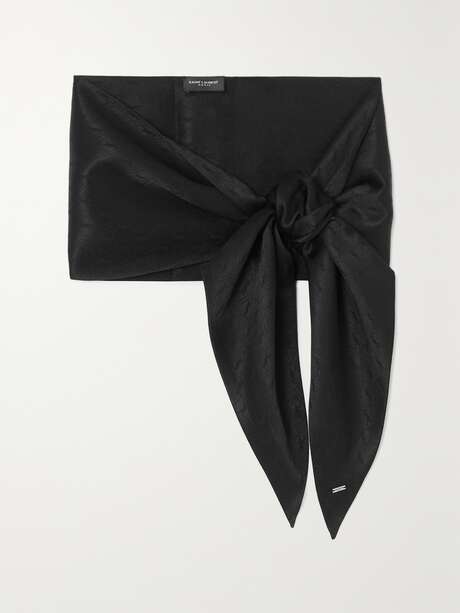 SAINT LAURENT's scarf has been crafted in Italy from silk and jacquard-woven with the label's iconic 'Cassandre' motif in tonal threads. Tie yours around the neck or the strap of one of the brand's iconic bags.