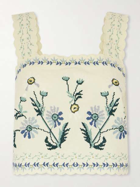 SEA Audra scalloped embroidered cotton and linen-blend top