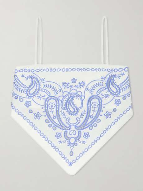 Self-Portrait’s top takes cues from vintage scarves. Made from a linen and cotton-blend, it’s intricately embroidered with paisley motifs and cut to an asymmetric, handkerchief hem that highlights the waist.