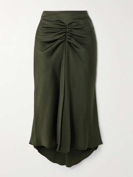 Victoria Beckham's 'Bella' skirt embodies the label's signature elegance. Made from dark-green satin-crepe, it's cut to skim the body and has a ruched front. Wear yours with a slim sweater tucked into the waistband.
