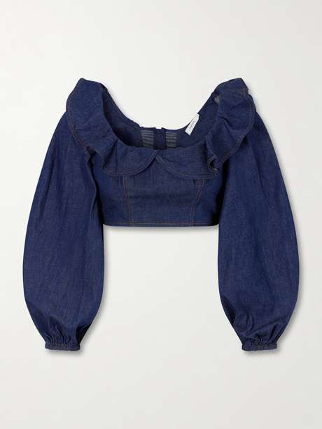'Aster' top by Zimmermann is cut from cotton-denim with a cropped, fitted bodice and frilled square neckline. The long billowing sleeves add soft volume, while the exposed back and zip fastening keep the silhouette defined.