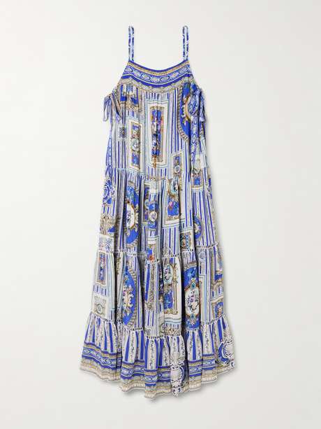 CAMILLA Tie-detailed lace-trimmed tiered printed silk-satin maxi dress