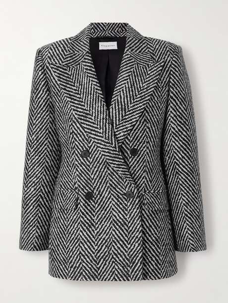 Givenchy's blazer was striking at the Fall '25 show. It's flawlessly tailored from herringbone wool-blend – the structured shoulders and double-breasted placket create a dramatic hourglass shape.