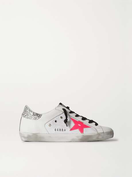 EXCLUSIVE AT NET-A-PORTER. The latest version of Golden Goose's favored 'Superstar' sneakers has been expertly made in Italy from distressed white leather and canvas. Set on a gripped rubber sole, they feature the brand's signature star appliqué at the side in vibrant pink. Make sure the glittered heel tabs are in view with a pair of cropped pants.