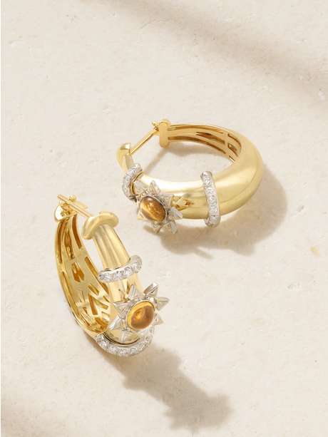 L'Atelier Nawbar’s earrings are handmade from 18-karat yellow and rhodium-plated white gold and wrapped with two diamond-encrusted rings - a defining detail seen throughout the 'Buoy' range. They have tiny star-shaped motifs encrusted with glowing citrines. Wear them solo or alongside another pair of the label's chunky hoops.