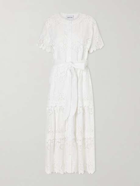 Miguelina’s ‘Romilly’ dress is cut from a cotton and linen-blend and intricately embroidered in the label’s signature Cloisters motif. Designed with a round neckline and buttoned front, it falls to an ankle-length skirt traced with scalloped edges and cinched with a self-tie belt for gentle definition.