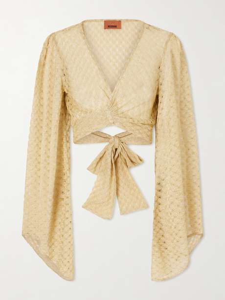 MISSONI Cropped metallic crochet-knitted wrap top