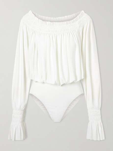 Norma Kamali's off-the-shoulder bodysuit is designed to stay perfectly in place when tucked in. It's made from soft jersey with gathering along the neck and cuffs to create that '70s-inspired peasant shape.
