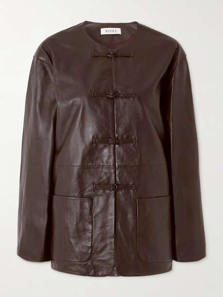 RÓHE's 'Marie' jacket features a Mandarin collar and traditional pankou fastenings, nodding to classic Chinese tailoring. Made from leather, it has a slightly loose shape enhanced by wide sleeves.