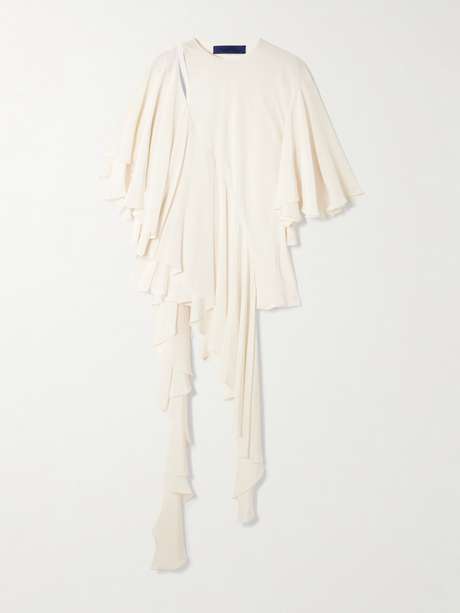 Sharon Wauchob's unpredictable, unconventional edge offers modern style. The 'Thea' top is cut from silk and is artfully draped with cascading ruffles. Alongside the floaty angel sleeves is a subtle cutout for an experimental finish.