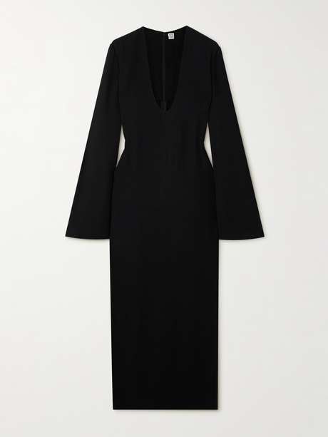 TOTEME's collections are a masterclass in refined simplicity. Worn on the Fall '25 runway, this knitted maxi dress drapes effortlessly over your frame and has a scarf-like panel and sculptural bell sleeves. Complement the plunging neckline with a chic pendant.