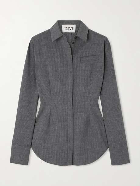 TOVE's 'Elvin' shirt is minimalist and modern. Made from a textile that's woven with wool for weight and drape, it has concealed fastenings and darting to subtly draw in the waist.