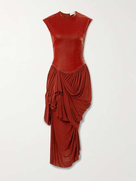 Zimmermann's dramatic red 'Memento' dress appeared on its Fall '25 runway with a set of gold-tone earrings and a pair of strappy heels. Part of the 'Hypnotic' collection, it has a close-fitting velvet bodice contrasted by an artfully draped stretch-knit skirt.