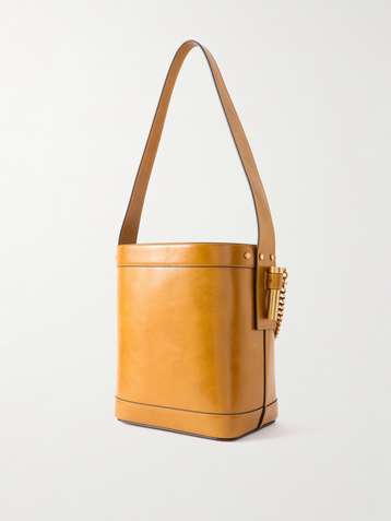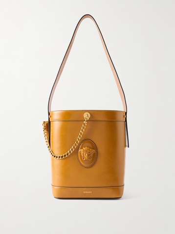 Vlogo Signature small embellished leather-trimmed striped raffia bucket bag