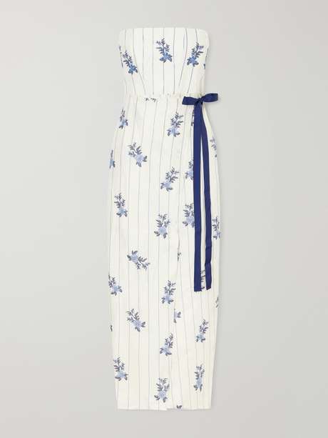 A study in contrast and control, Agua by Agua Bendita’s 'Cinefila Valle' maxi dress is crafted from linen to a slim, strapless silhouette. Embroidery softens its clean structure, while a contrasting side bow introduces subtle tension. A refined piece for warm-weather occasions.