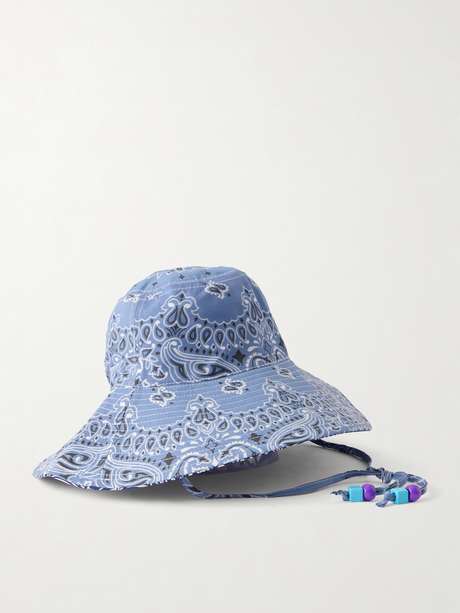 Call It By Your Name's 'Capeline' bucket hat is handcrafted from authentic cotton bandanas produced in the USA. It has a reversible design and ties with strings tipped with colorful beads.