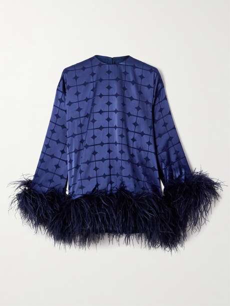 Dima Ayad's glamorous designs are elevated by thoughtful details. Cut from glossy devoré-satin, this blouse is patterned in geometric crosses and trimmed with frothy tonal feathers along the cuffs and hem.