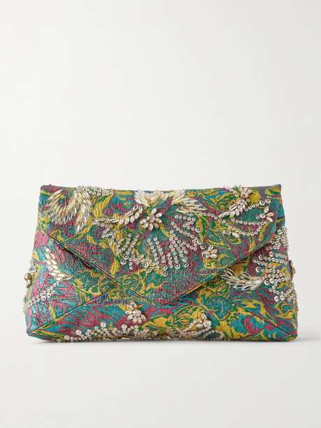 Dries Van Noten’s clutch dazzles with crystal and sequin embellishments that complement any jewelry. Made from metallic floral jacquard in an envelope shape, it offers enough space inside for essentials like your phone, wallet, and lipstick.