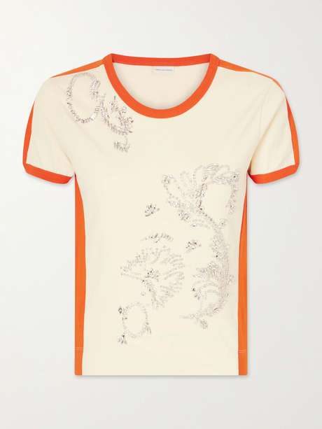 Dries Van Noten’s 'Hental' T-shirt showcases the label’s ability to elevate simple staples. Made from soft cotton-jersey with sporty contrast trims, it's decorated with intricate crystal embellishments arranged in delicate, nature-inspired motifs across the front.