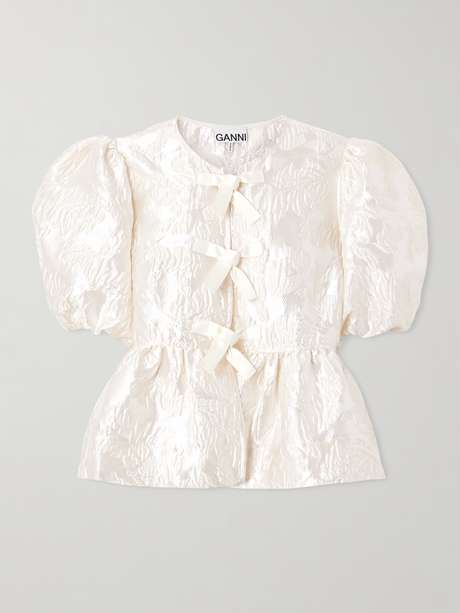 Famed for a directional approach to design, this GANNI blouse is cut from cloqué adorned with damask-inspired blooms and features adorable bows. It has billowy sleeves and a voluminous peplum hem.