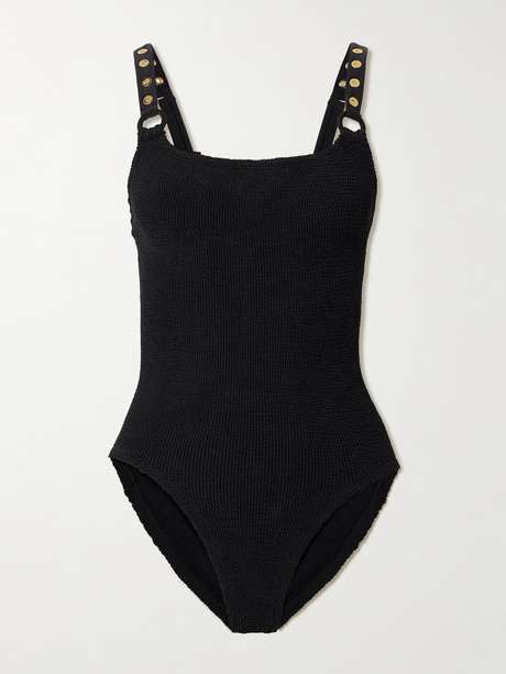 Hunza G's 'Melody' swimsuit is embellished with gold-tone eyelets at the straps. It's made from the brand's supportive 'Crinkle™' seersucker and has a classic scooped neckline.