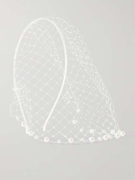 Jennifer Behr's 'Perline' voilette headpiece is crafted from sheer lace with delicate pearl trim. Designed to frame the face with a soft, structured silhouette, it adds a refined finish.