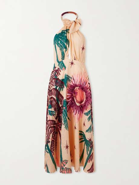 Johanna Ortiz's 'Western Elements' dress has been locally made in Colombia from linen-blend and finished with a leather-trimmed halterneck. The airy back makes it ideal for balmy climes, while the hand-drawn palm trees and beaming sun motif capture the spirit of the tropics.