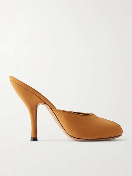 Emerging label JUDE approaches footwear with a sculptural sensibility. The 'Date' mule is crafted from smooth suede in a streamlined silhouette with a rounded peep toe and slender sculpted heel. The slip-on design feels minimal yet expressive, lending a refined finish to evening dressing.