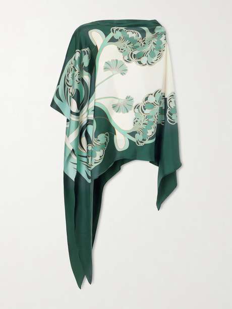La DoubleJ’s blouse is cut from silk-twill in an asymmetric silhouette, the sweeping motif unfurling along the frame. It drapes from a slanted neckline into a single elongated sleeve that echoes a scarf-inspired silhouette.