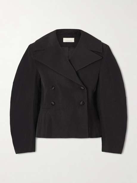 You can always rely on LIBEROWE's fine tailoring to polish and upgrade any look. This 'Jiani' jacket is cut with a double-breasted front and exaggerated curved sleeves. The covered buttons are an elegant finishing touch.