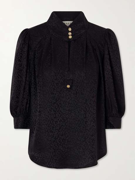 Maison Mayle’s 'Papisoleil' blouse channels the label’s vintage-inspired femininity. Cut from lustrous silk-satin with a tonal leopard-jacquard, it has softly puffed sleeves and a high collar accented with gold-tone buttons above a delicate keyhole neckline.