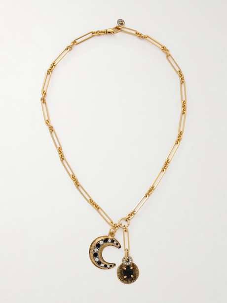 Maison Mayle's jewelry is imbued with so much charm. This 'Soli Luna' necklace is made from gold-plated brass and anchored with two pendants that are set with shimmering crystals and semi-precious obsidian stones.