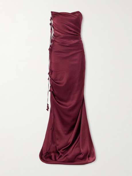 Marmar Halim is known for its refined, feminine designs, and this gown is a perfect expression of that vision. Cut from smooth satin with a strapless neckline and adorned with delicate floral appliqués, it falls to a pooling hem that creates an effortlessly elegant line. Pair it with simple heels and minimal jewellery to let the silhouette's romantic detailing stand out.