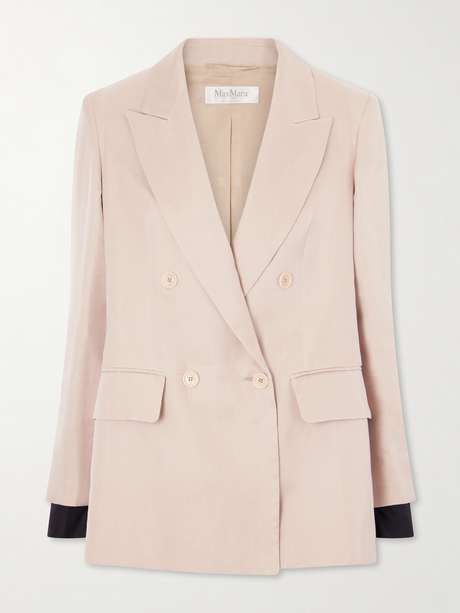Max Mara's Spring '26 collection reworks classic tailoring with extended black cuffs. Cut from silk, this blazer is double-breasted with padded shoulders that define the silhouette. Style it with tailored pants or a pleated skirt. Cut from silk, this blazer is double-breasted with padded shoulders for a defined, structured shape. Style it with tailored pants or a pleated skirt.