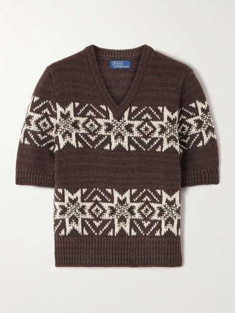 Polo Ralph Lauren's sweater is intarsia-knitted with a playful Fair Isle snowflake motif. It's spun from a cotton and wool-blend and has a close fit, a V-neckline and puffed sleeves.