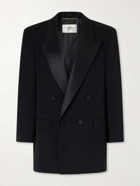 SAINT LAURENT Double-breasted satin-trimmed grain de poudre wool blazer