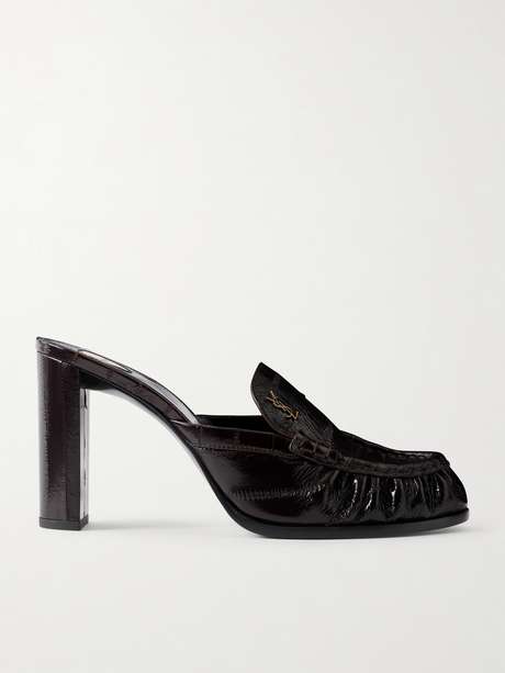 SAINT LAURENT’s signature 'Le Loafer' is reinterpreted in a heeled silhouette. Made in Italy from glossed eel, these pumps are ruched at the toes and finished with a gold-tone 'Cassandre' plaque at the penny slots, nodding to the house’s enduring codes.