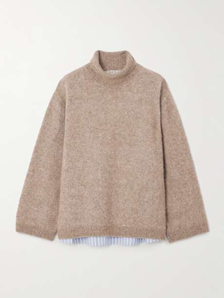 Sea's hybrid 'Mallory' sweater has a shirting-inspired back. It's knitted with touches of wool and llama for a soft handle and has a relaxed ribbed turtleneck and dropped shoulder seams to enhance the relaxed fit.