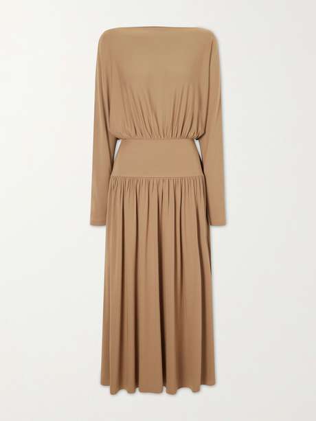 The gathered detailing on TOTEME's dress recalls the draping of ancient Roman togas. Made from stretch-jersey, it has a cinched waist and an elegant boat neckline framing the batwing sleeves. Style yours with statement earrings.
