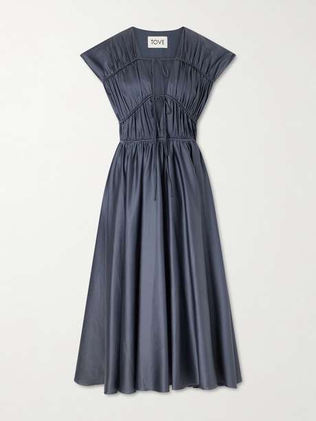 The TOVE 'Ceres' dress is a study in soft structure and understated volume. Designed with a gently fitted bodice and a gathered waist, it falls into a full, flowing maxi skirt that moves with quiet elegance.
