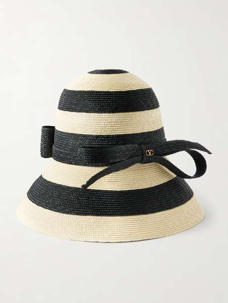Valentino Garavani's "VLOGO Signature" bucket hat is woven from braided straw with bold black stripes. A tonal ribbon and metal emblem accent the structured silhouette, offering shade while complementing warm-weather looks.