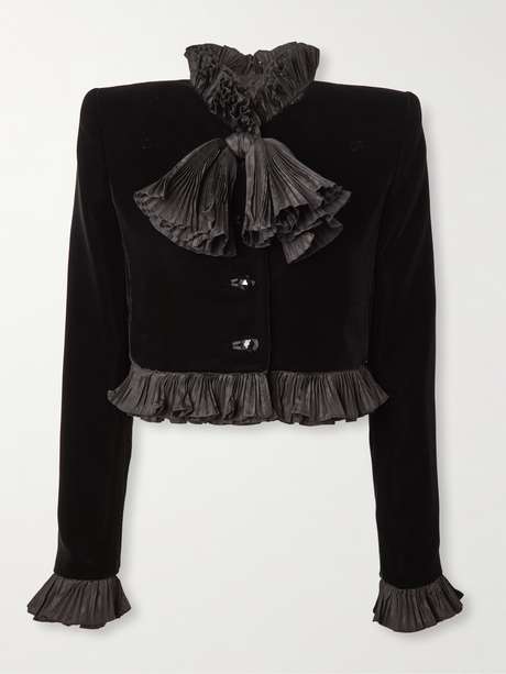 Channeling the retro feel of the Fall '25 runway collection, Valentino Garavani's jacket is adorned with pleated silk-taffeta ruffles. Made from smooth velvet, it has an ethereal pussy-bow neckline and glossy faceted button fastenings.