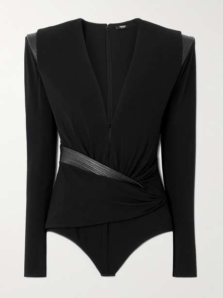 Versace's bodysuit was seen on the Fall '25 runway, which embodied a "rock 'n' royalty sensibility". Cut from crepe-jersey with a plunging neckline, it's trimmed with leather along the structured shoulders and gathered waist to enhance the wrap effect.