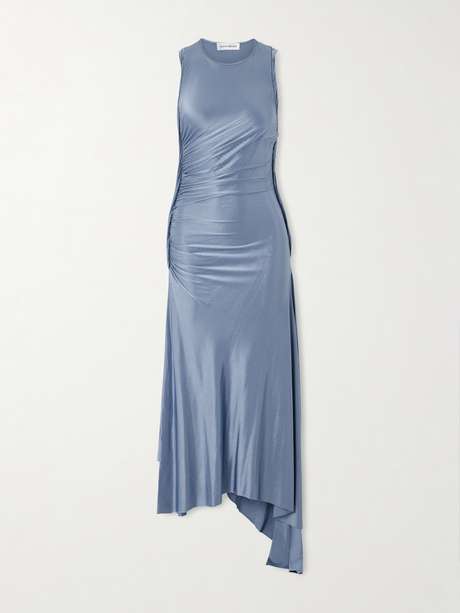 Victoria Beckham's midi dress is artfully twisted and gathered, cinching the fitted silhouette and highlighting the slinky satin-jersey. Add height to the swishy handkerchief hem by teaming it with sky-high stilettos, as the designer would.