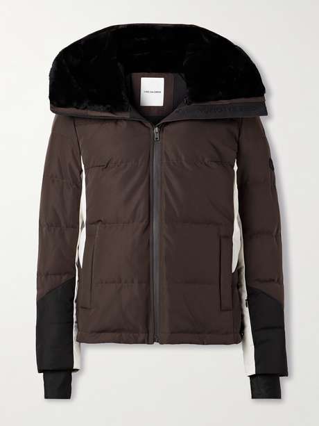 Yves Salomon's jacket is equal parts chic and practical. It's made from wind- and water-resistant shell in a palette of dark-brown, black and cream and has a plush shearling collar and detachable hood.