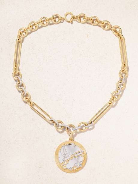 Foundrae's necklace features an engraved sparrow pendant, believed to be a symbol to withstand adversity and uphold hope. The clip chain is artfully handmade from 18-karat yellow and white gold and it's scored with scintillating diamonds.