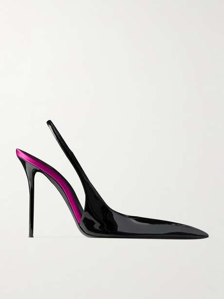 SAINT LAURENT's 'Amalia' slingback pumps have elongated square toes that instantly set them apart from other styles. Made in Italy from glossy patent-leather, they're traced with vibrant magenta satin along the sole and have towering 110mm stiletto heels.