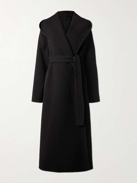 Alaïa's belted coat is a study in feminine elegance. It's cut from double-faced wool in a wrap-inspired front and is topped with shawl-inspired lapels that flow into a hood.