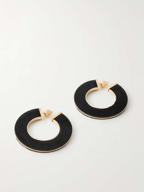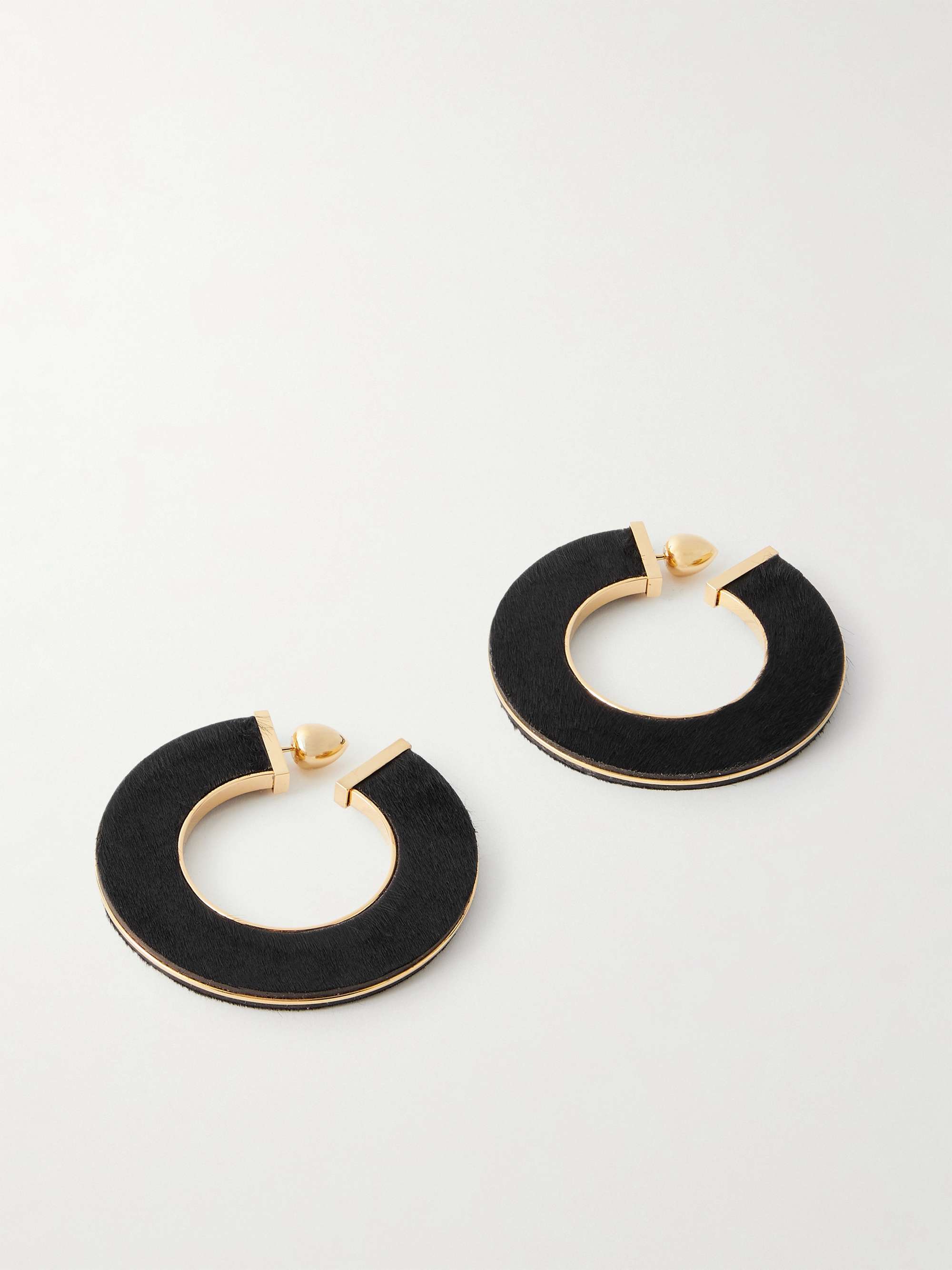 Alaia's 'Blade' earrings are named for their sculptural, curved shape. They're made from gold-tone metal and covered with calf hair.